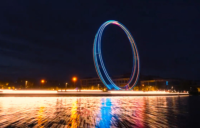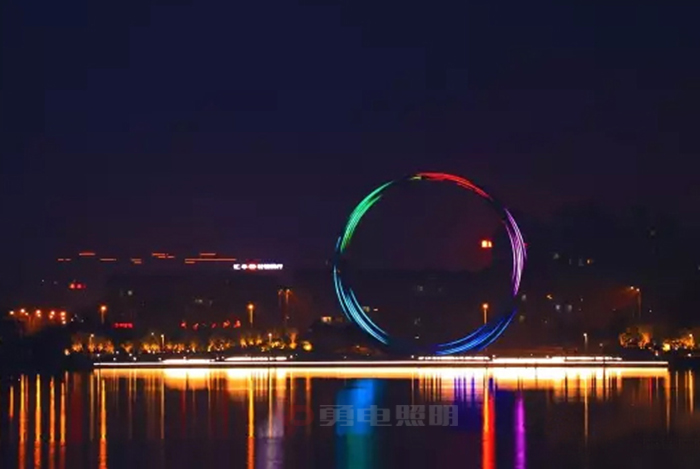 櫻花湖之戀是一座環(huán)形雕塑,坐落于威海櫻花湖體育公園。雕塑內(nèi)部凹槽上,安裝12條由勇電定制二次封裝70線條燈組成的光帶,光帶沿著環(huán)形輪廓鋪設(shè),夜間亮燈后將雕塑變身為一個巨大的色彩斑斕的變色環(huán)。