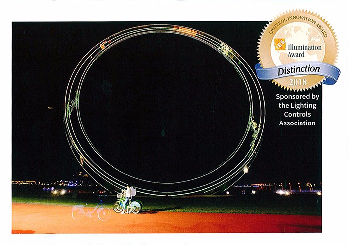 現(xiàn)場頒發(fā)獎項時介紹到:櫻花湖之戀項目雕塑燈光由自行車體感互動控制系統(tǒng)控制,通過騎動自行車可以控制燈光的變化形式以及變化速度。例如,自行車騎得越快,燈光變化就越快,有10秒騎行,就有10種相應(yīng)形式的變化,當(dāng)騎手中某人騎得較快時,燈光變化就主要由他帶動著。