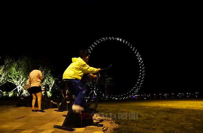 雕塑夜景燈光呈現(xiàn)上以騎單車這一運(yùn)動為載體,打造人與燈光的互動。雕塑照明燈具內(nèi)置勇電體感互動控制系統(tǒng),并與單車進(jìn)行相連,系統(tǒng)可以通過傳感器將踩踏的速率轉(zhuǎn)化為控制信號,來改變鑲嵌在雕塑上的燈光,燈光隨著騎車人車速的變化而變化,現(xiàn)場12輛單車可分為合作模式、單人競技、分組競技三種互動方式。