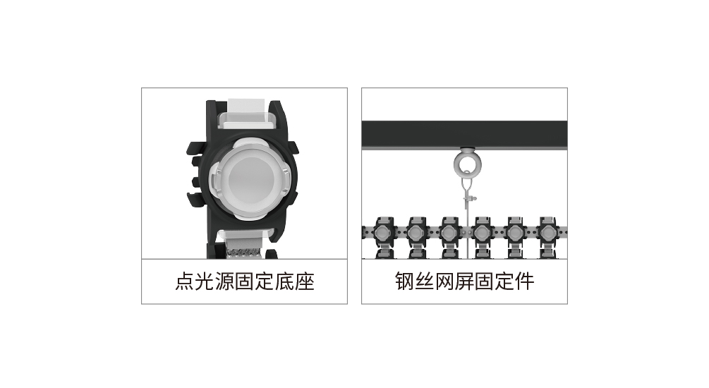 1、使用不銹鋼絲網作為光源固定。 2、采用二次封裝點光源配合塑膠固定件安裝。 3、易安裝、運維、運輸。